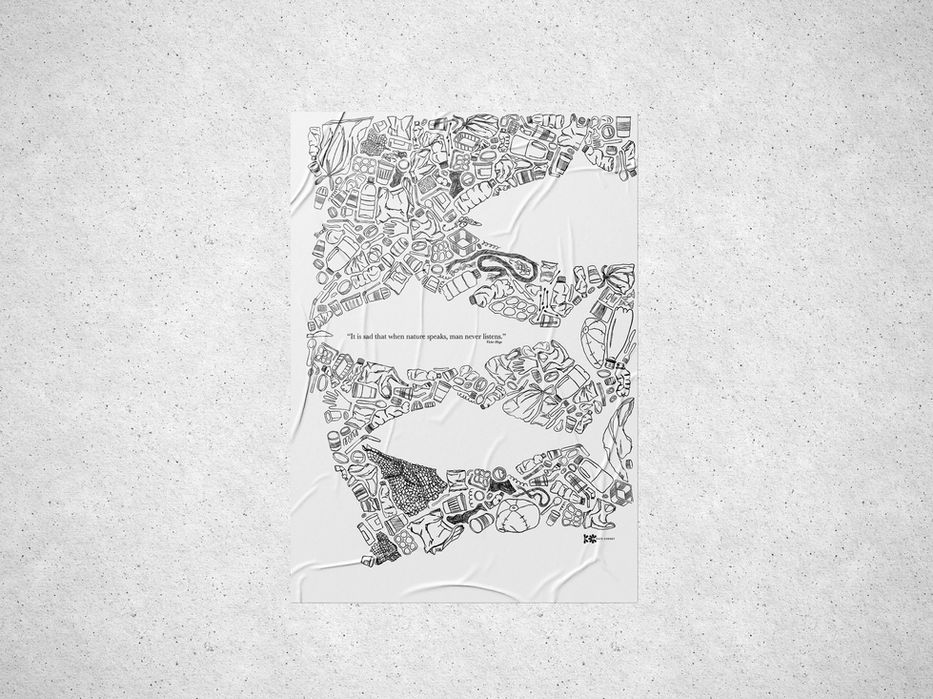 For an open call by Poster for the Planet, I created a hand-illustrated design depicting pieces of ocean waste — from plastic bottles to discarded fishing nets. The illustrations cover most of the poster, leaving an irregular negative space that suggests the movement of the sea, while surrounding fish appear trapped and suffocated by the debris. The design conveys the urgency of ocean pollution and its impact on marine life.